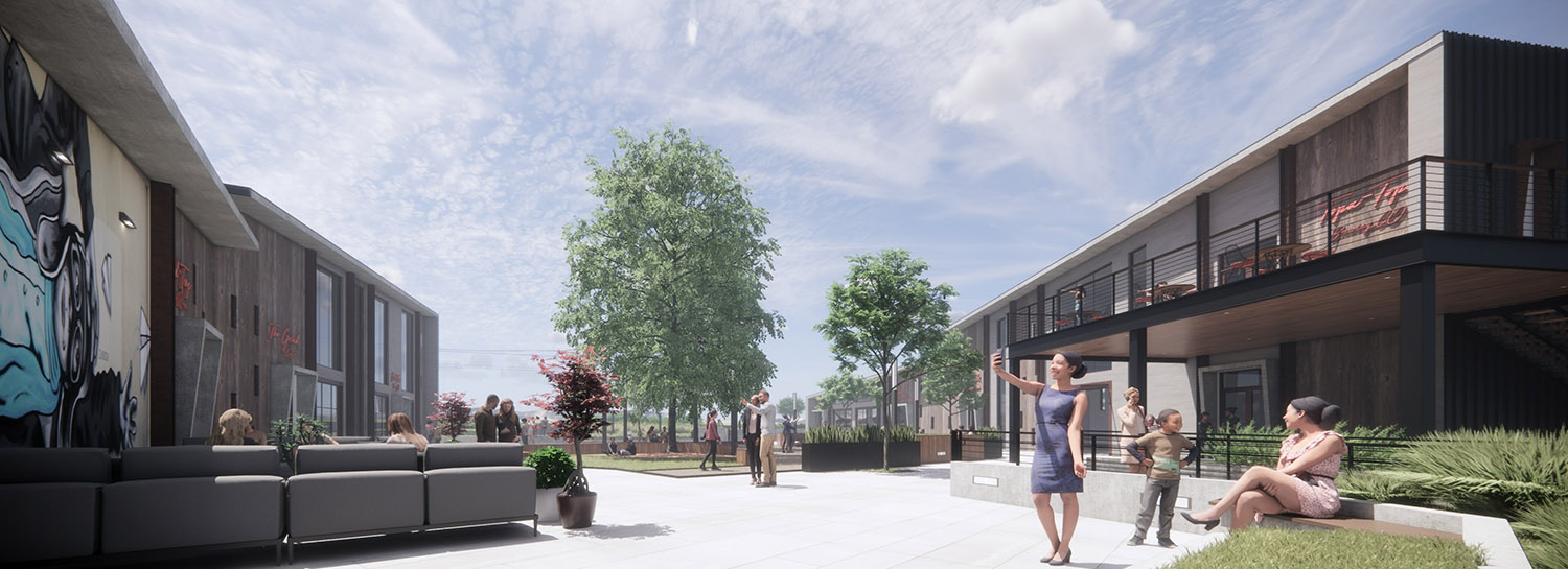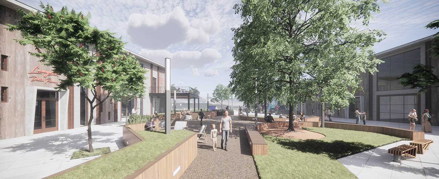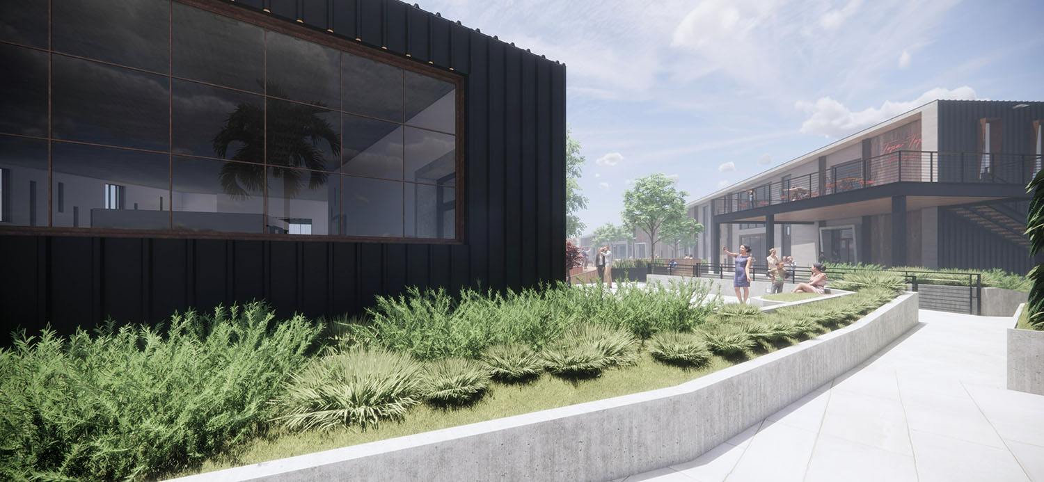 As illustrated in the renderings, the architectural language blends modern industrial forms with warm, tactile materials, including wood cladding, metal paneling, and concrete elements. Large, glazed openings and mezzanine levels with indoor-outdoor access activate the courtyard and upper levels, allowing residents and patrons to naturally come together to enjoy food, social life, and community interaction.